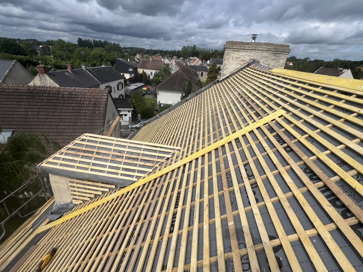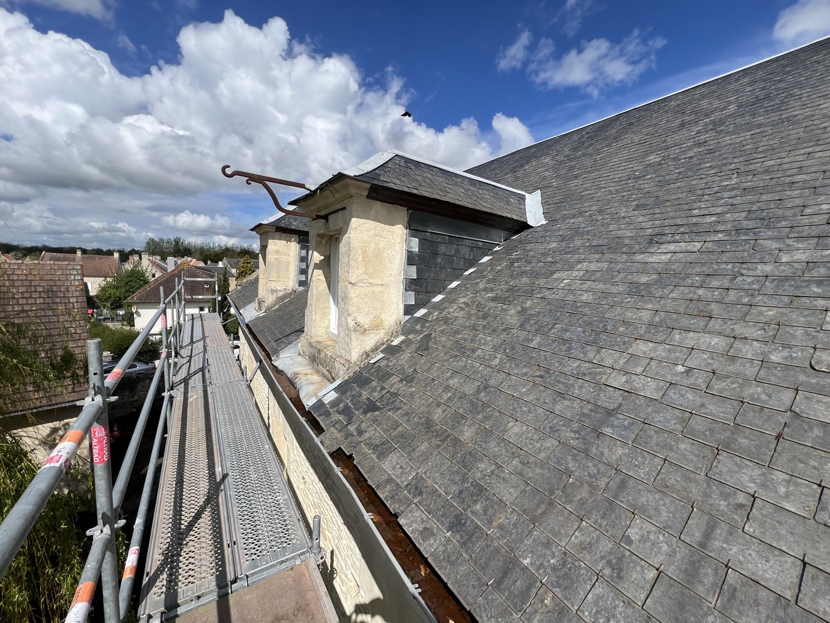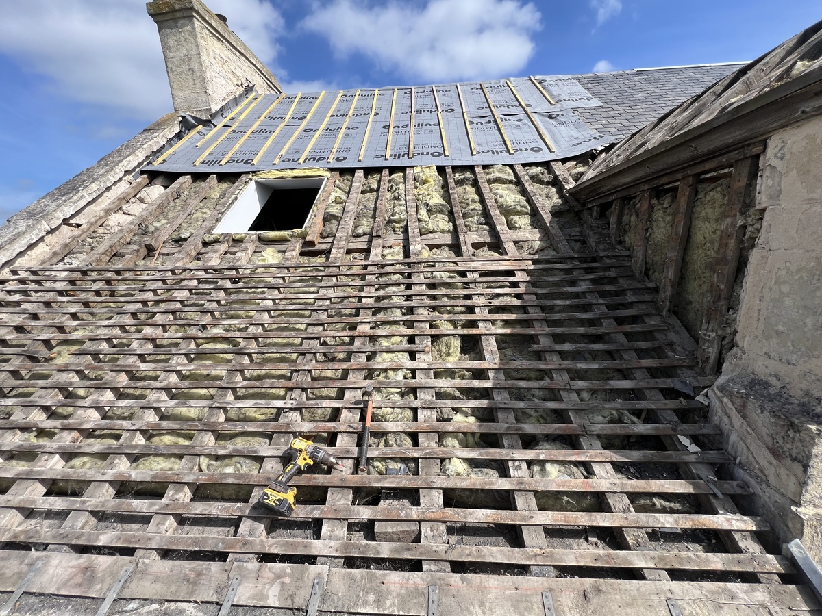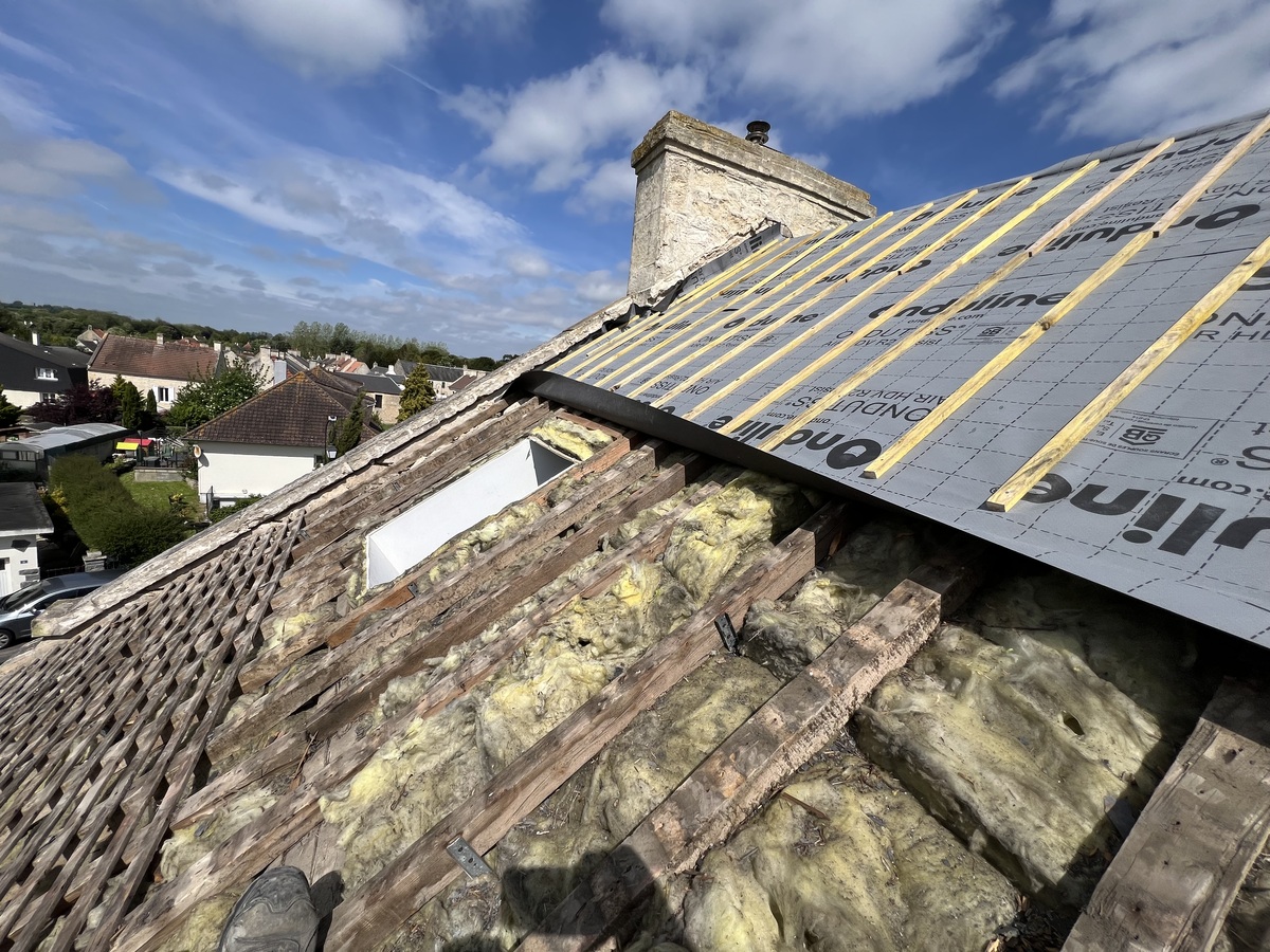 Ensuite, les anciennes ardoises sont soigneusement retirées. Cette phase de découverture est réalisée avec minutie pour éviter tout dommage à la charpente et préparer la surface pour les travaux suivants.