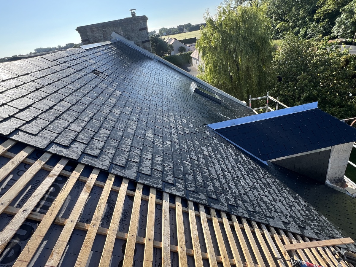 Les nouvelles ardoises naturelles de dimension 22/32 sont soigneusement posées. Chaque ardoise est fixée de manière à garantir une couverture étanche et durable, respectant les techniques traditionnelles.