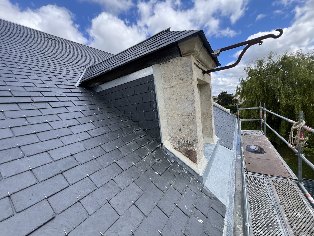 Pour les lucarnes, l'étanchéité est renforcée à l'aide de zinc naturel. Cette étape est cruciale pour éviter les fuites et assurer que les points de jonction entre la toiture et les lucarnes soient parfaitement scellés.