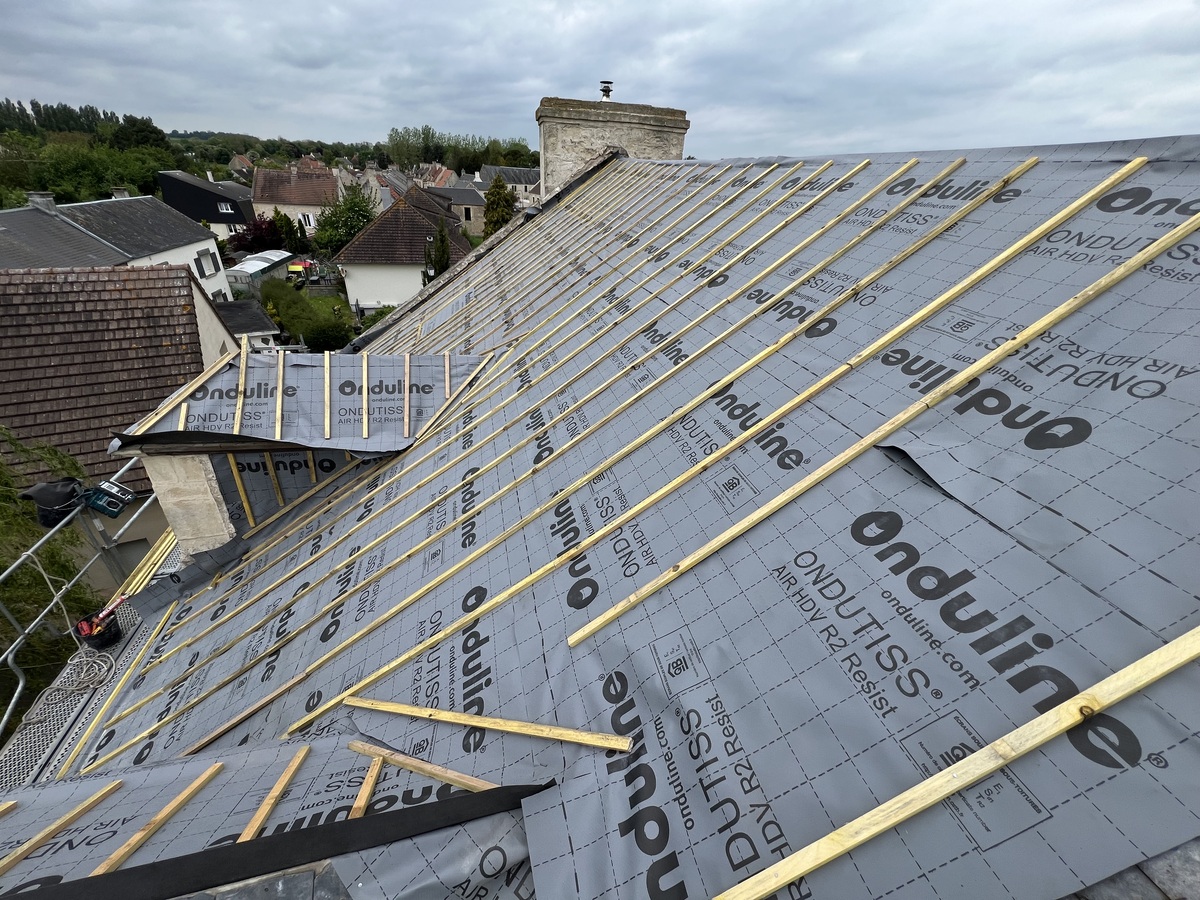 Une sous-toiture est installée pour assurer une protection supplémentaire contre les intempéries. Cette couche intermédiaire joue un rôle crucial en empêchant les infiltrations d'eau et en améliorant l'isolation thermique de la maison.